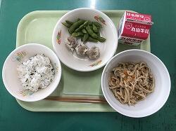 〇今日の給食は、減量わかめごはん、担々麺、シューマイ、ゆで枝豆でした。