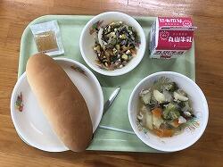 〇給食のメニューは、コッペパン(りんごジャム)、鶏肉ときのこの煮込み、ひじきとチーズのサラダでした。