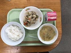 〇麦ごはん、春雨のオイスターソース炒め、、ワンタンスープでした