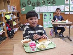 〇今日の給食のメニューは、麦ごはん、もみの木ハンバーグ、野菜スープ、クリスマスデザートでした。