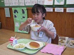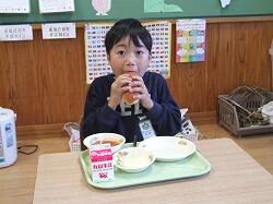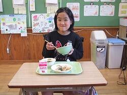 〇今日の給食のメニューは、米粉パン、かぼちゃのクリームシチュー、柚子ドレッシングサラダでした。