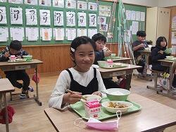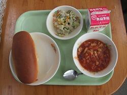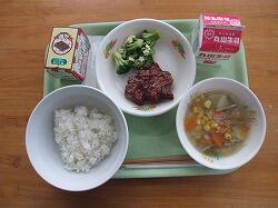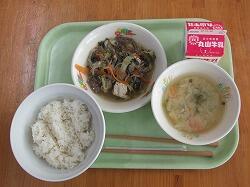 明日の給食のメニューは、麦ごはん、豚キムチ炒め、春雨スープです。