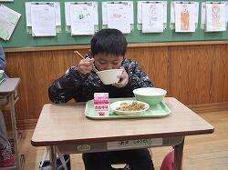〇今日の給食のメニューは、麦ごはん、美郷牛のすき焼き煮、えのきと揚げの味噌汁でした。