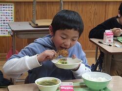 月曜日の給食のメニューは、麦ごはん、とんかつ、みぞれ汁(入試応援献立)です。