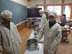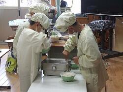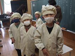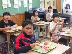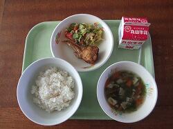 〇今日の給食のメニューは、麦ごはん、鮭の塩焼き、高菜の炒め物、栄養すいとん汁、デザート)でした。