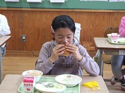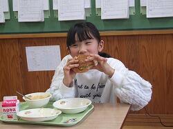 〇今日の給食のメニューは、麦ごはん、ナバ手羽餃子、豆腐とあおさのスープでした。(サラダには、戸髙さんが生産されたミニトマトが使われています!!)