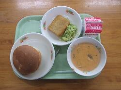 明日の給食のメニューは、フィッシュバーガー、キャロットポタージュスープです。