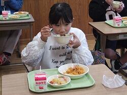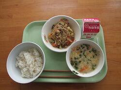 〇今日の給食のメニューは、麦ごはん、春雨のオイスターソース炒め、にら玉スープでした。