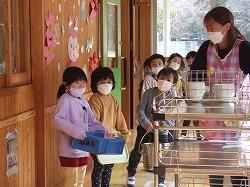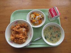 明日の給食のメニューは、チキンライス、卵とコーンのスープ、フルーツポンチです。
