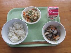 明日の給食のメニューは、麦ごはん、鶏肉と里芋の含め煮、千切り大根の酢の物です。