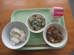 〇今日の給食のメニューは、麦ごはん、肉じゃが、洋風白和えでした。