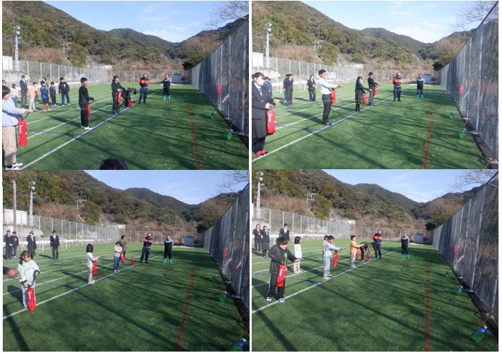 本日の5校時は、理科室で火災が発生したことを想定して避難訓練を実施しました。校内に緊急放送をした後、訓練の119番通報を行い、児童生徒は担任の先生方の誘導で運動広場に避難しました。また、島浦町第55部消防団の方々を講師としてお招きし、消火器の使い方をご教示いただいて、実際にどのようにして使うのか各自で訓練しました。大変意義のある訓練となりました。