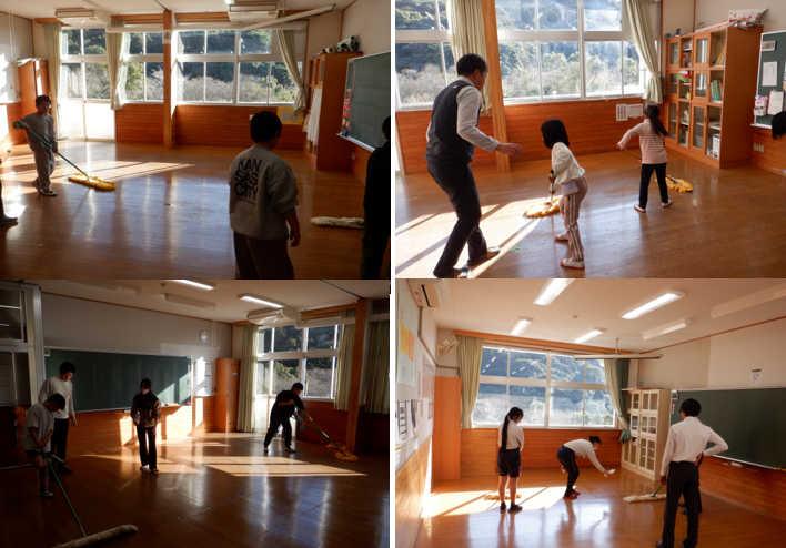 5校時後に教室の机や棚の荷物をすべて出して清掃を行い、教室の床にワックスがけをしました。週末にかけて乾燥させ、週明けに机などを元に戻します。きれいな床になりました。