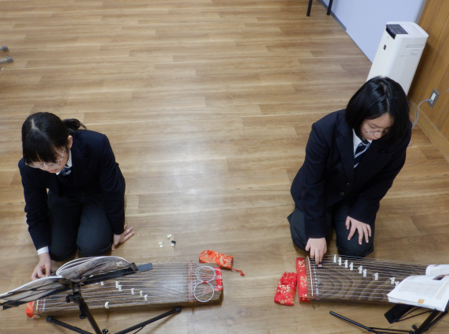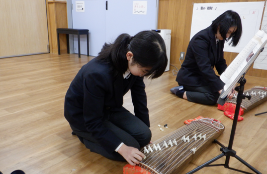 3校時、7年生の音楽では筝の授業を行いました。箏の右側に座り、右手の指に演奏用の爪をつけ、楽譜を見ながら演奏の練習を行いました。日本古来の和楽器にふれる貴重な機会となりました。