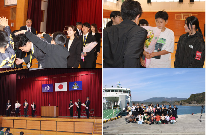 別れの季節です。7名の先生方が島野浦学園を去られることになりました。離任式では離任される先生方から子どもたちに向けて心温まるごあいさつをいただきました。児童生徒代表別れの言葉の後、児童生徒全員で花束をお渡しし、校歌を歌いました。式が終わると、アーチを作って、涙、涙で先生方を送り出しました。宇治のフェリー乗り場に、全校児童生徒、保護者・地域のみなさんがたくさん集まってくださり、11時に出航。先生方の姿が見えなくなるまで手を振って、別れのテープにてお見送りすることができました。7名の先生方、島野浦学園の子どもたちのために尽力していただきました。新天地でのご活躍をお祈りするとともに、先生方が築いてくださったバトンを受け継いで、さらに発展していきたいと思います。ありがとうございました。