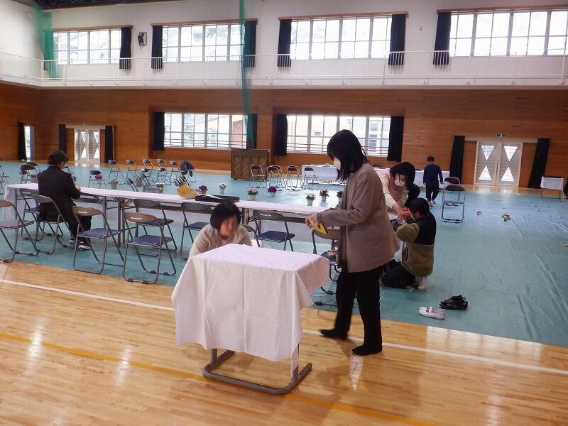 朝から離島センターに集合し、机、椅子出しをしました。高速艇入り口横の駐車スペースに机と椅子を並べました。そのあと、離島センターのテント2張りを水揚げ場に移動させて設置しました。