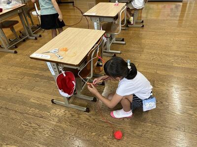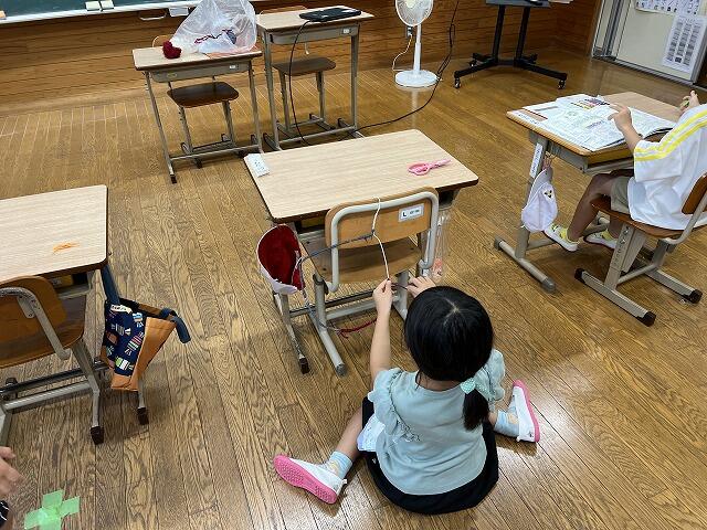 1年生の教室では、ハンガーに毛糸を巻き付けていました。来週の金曜日にシャボン玉を作るそうです。ずいぶん大きなシャボン玉になりそうです。