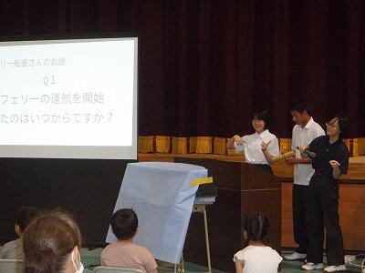 次は、8年生、個人、9年生の発表です。8年生は、島浦学で学んだ「島で活躍する人々」の紹介。島の暮らしに欠かすことのできないフェリーについて、クイズを交えて紹介しました。個人発表は、5年生がいわき市との交流活動の報告をしてくれました。9年生は、島浦学で島の活性化について調べ、島のよさを表現する自作のポスターを発表しました。また、後期課程はそれぞれ、7月に実施した職場体験のことについても写真や動画、クイズを交えて分かりやすく伝えていました。