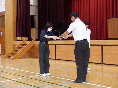 まずは、日曜日に行われた中体連秋季大会の表彰です。本校から5名出場し、全員がベストを尽くしてプレーしました。そしてその結果、2名が入賞し、県大会への切符を勝ち取りました。学園代表、延岡代表として、精一杯がんばってほしいです。