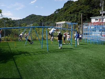 給食を食べ、ごちそうさまをしたら昼休みです。本校自慢、全面人工芝の運動広場に集合。はじめはのぼり棒やうんてい、ブランコで遊んでいましたが、そのうち真ん中でサッカーが始まり、いつの間にか大人数でボールを追いかけていました。