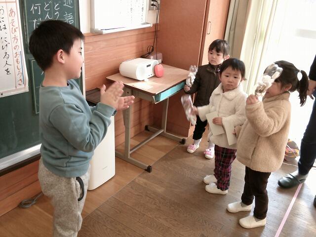 今日は、2年生が計画、準備してきた「おもちゃ祭り」が開催されました。参加してくれたのは何と、島野浦保育所の子ども達です。