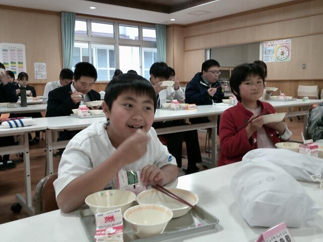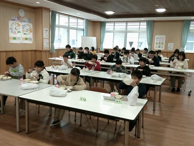 また、この日の給食の献立に、ちらし寿司とひなあられが登場しました。あさっては3月3日、桃の節句です。現在、感染症対策として全員前を向いて黙って食べていますが、季節感たっぷりのおいしい給食に、大満足の子ども達でした。