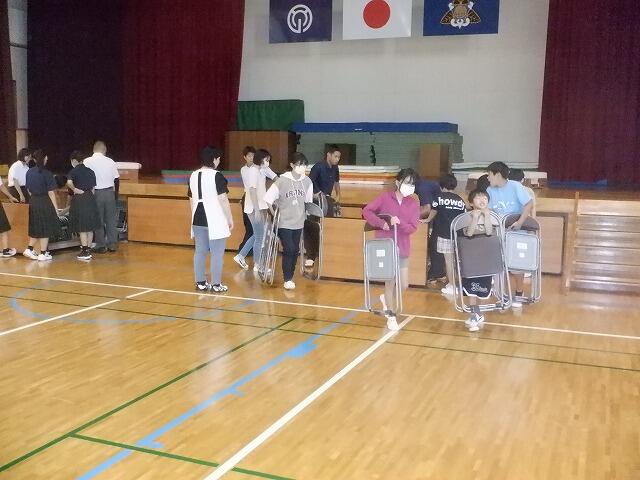 まずは体育館にシートを敷き、椅子を並べます。その後、自分たちや島民の方々が出展してくださった作品を掲示しました。みんなで協力して作業したので、あっという間に会場が完成しました。