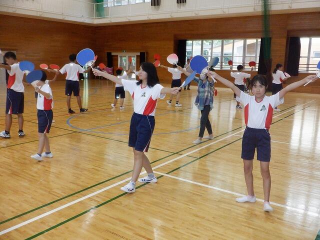 今日は、スポーツデイに向けた1回目の全校体育でした。今回は特別講師をお招きし、毎年恒例の「うちわ踊り」の練習をしました。