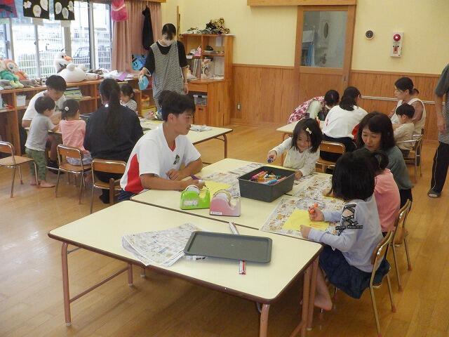 廊下にあるベンチを土台にして、思い思いに段ボールを貼り合わせ、新聞紙で屋根を作ります。ドアを取り付けたりシールで飾りつけをしたりして、あっという間に2軒の楽しいおうちができあがりました。最後にそれぞれ記念撮影。みんな、とてもいい笑顔です。