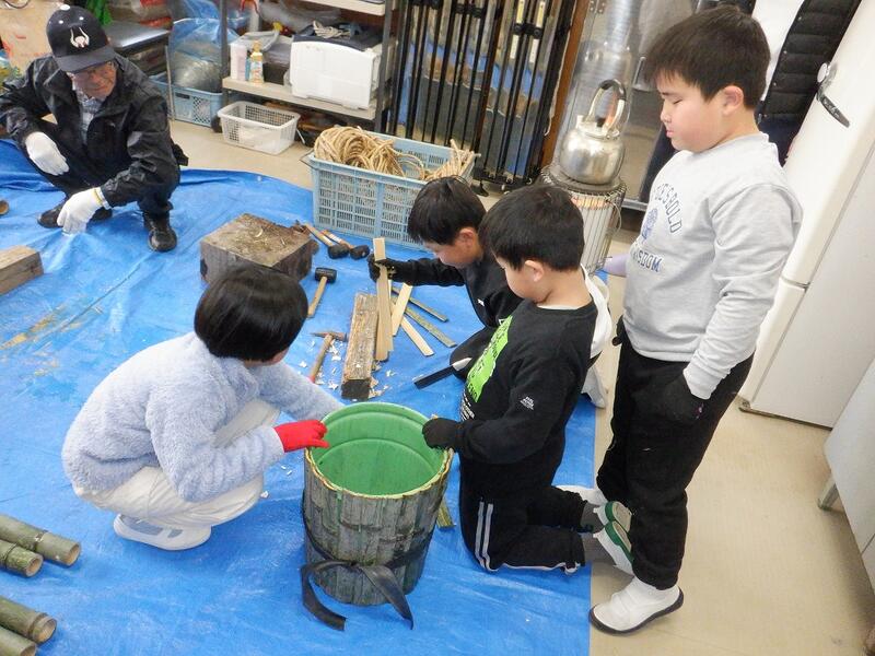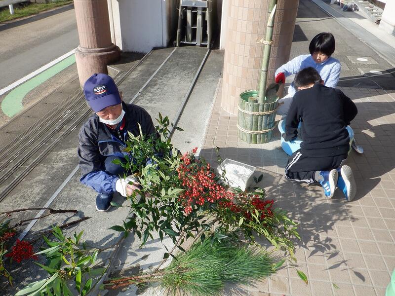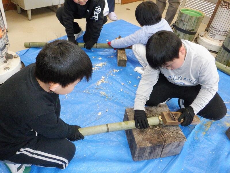 地元の方が竹や南天などの材料を準備してくださり、ごあいさつをしてから作業開始。まず、竹を特別な道具を使って6つに割り、その竹を丸い缶の外側にまきつけます。次にメインとなる竹にかんながけをして形を整えます。缶の中に砂を入れ、3本に結んだ竹を立て、最後に松・梅・南天・ユズリハなどを飾り付けて完成です。玄関前に立派な門松が設置され、お正月を迎える準備ができました。ご協力いただいた講師の方々に感謝するとともに、日本の伝統文化の継承に一役買うことができ、満足げな子ども達でした。