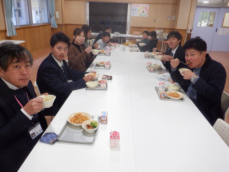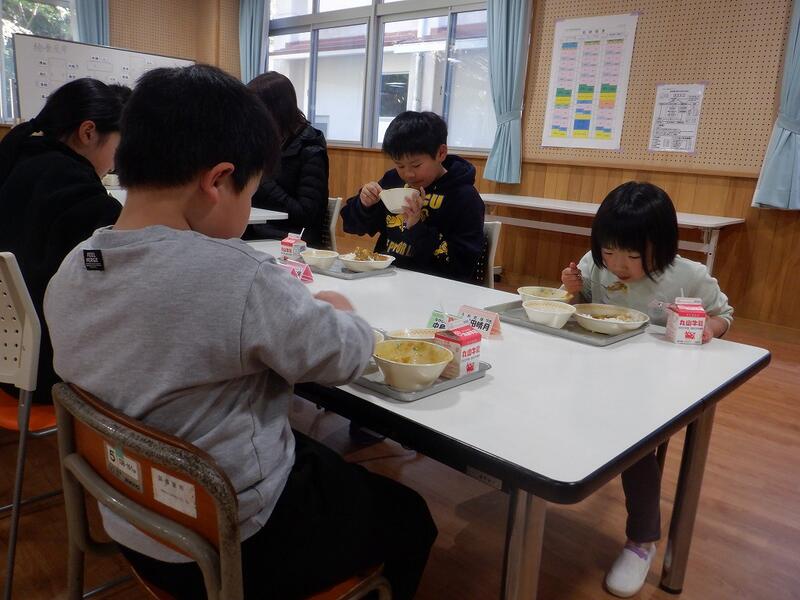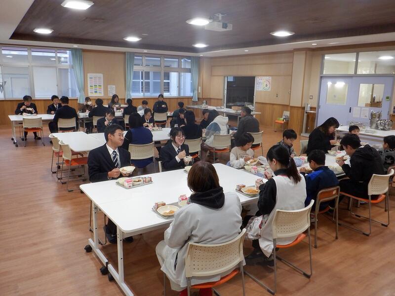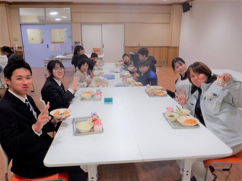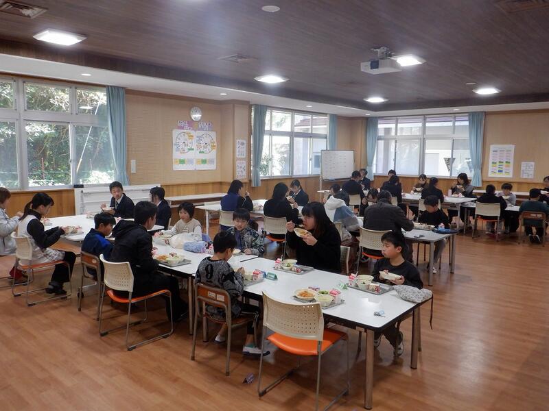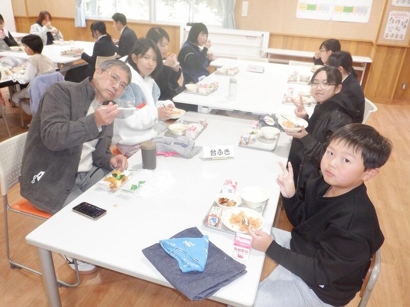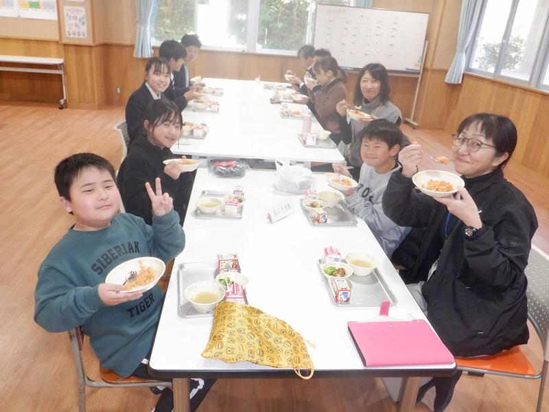 配膳の準備が整い、一斉に「いただきます」。各テーブルでのスマイル写真を掲載します。あっという間にデザートのケーキまで完食でした。栄養士の先生、そして調理員さん方のおかげで、島野浦学園の給食はとてもおいしく、子ども達は毎日残さずモリモリ食べています。感謝です。