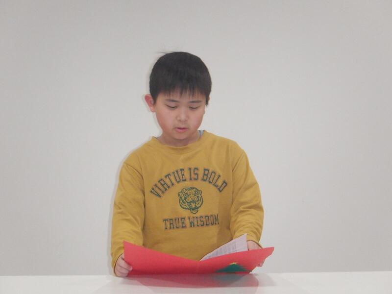 まずは文房具の英語での言い方を練習。中には鉛筆研ぎやホッチキスなど、難しい単語も出てきました。何度も繰り返して覚えた後は、会話形式のゲームです。一人1枚ずつ、文房具のイラストが描かれたカードが配られ、自由に動き回りながら、相手に「Do you have a ~?」と尋ねます。相手が持っていれば勝ち、というルールです。はじめは少し戸惑い気味でしたが徐々に慣れてきて、英語を使った会話を楽しんでいました。