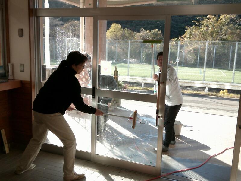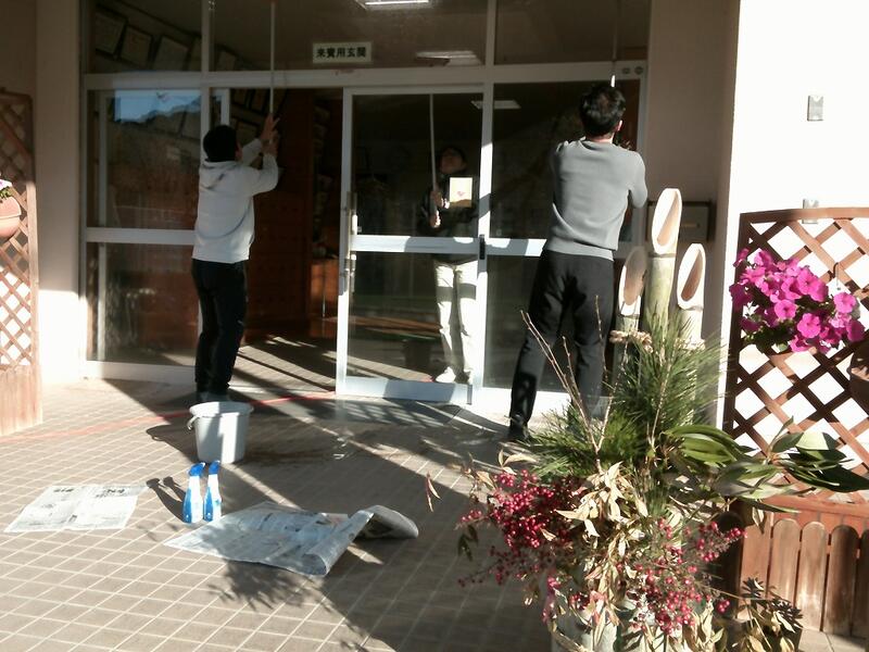 まずは、玄関の掃除です。窓ガラスをきれいに拭き上げました。次に、鏡餅としめ飾りを飾り付け、作業終了。これで、気持ちよく新年を迎えることができそうです。