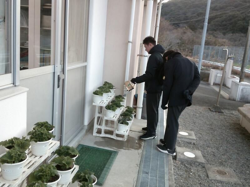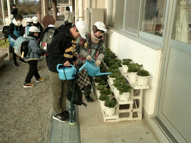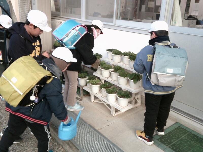 約1ヶ月前に定植したサイネリア。無事に年を越し、3月の卒業式に向けて順調に育っているようです。今朝はかなり冷え込みが厳しい中、登校してきた子どもたちが自分の苗に水やりをしていました。まだまだ、何色の花が咲くかは分かりませんが、このまますくすくと成長していってほしいものです。