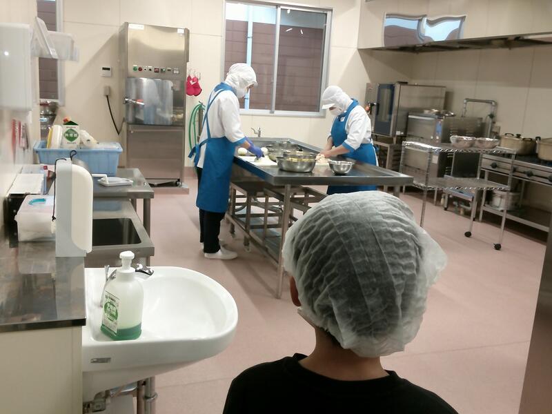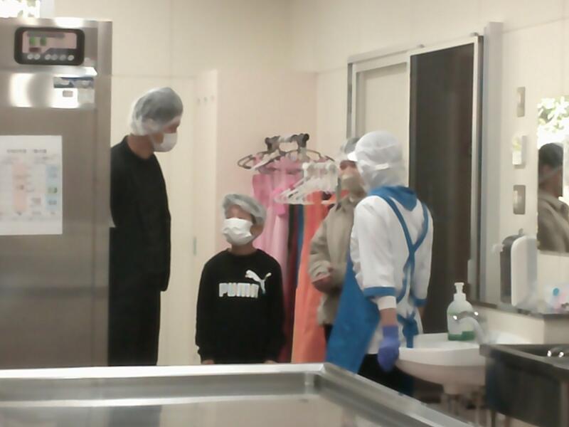 まずは栄養士の先生より、給食室の機材や作っているところの写真を見せてもらいました。次に、実際に給食室へ行き、調理の様子を見学しました。最後に調理員さんへの質問です。「どうしてエプロンの色が違うのですか?」「どんなことに気をつけて作っていますか?」など、熱心に聞いていました。