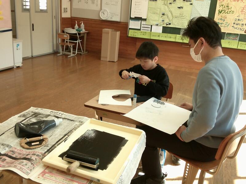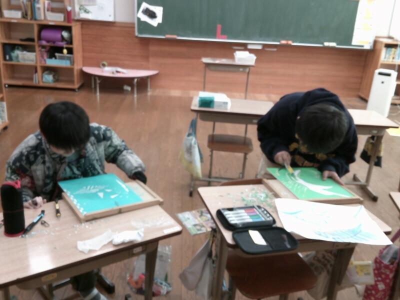 2・3年生は紙版画です。はさみを器用に使って、台紙に重ね貼りしているところです。一方、4年生以上は木版画。特に4年生は生まれて初めての彫刻刀ということで、慎重に彫り進めていました。5・6年生は彫刻刀の扱いにもずいぶん慣れてきて、すでにカラフルな色を使って刷る作業に入っている子もいました。できあがりが、とても楽しみです。
