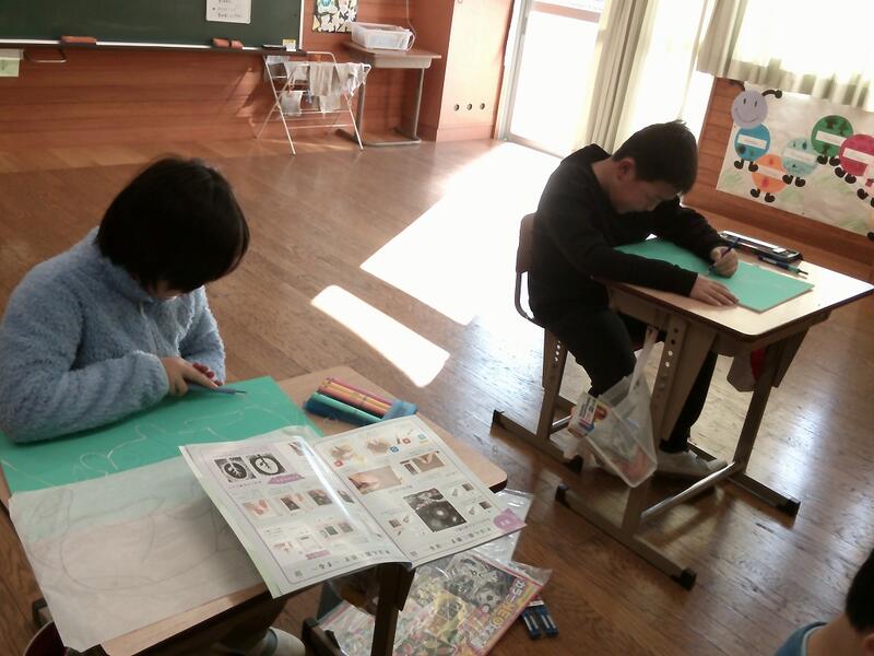 2年生は、「ともだちハウスをつくろう」。段ボールカッターを器用に使いながら、理想の楽しいおうちを作っていました。一方の3・4年生は、「顔を出したらなんだかワクワク」。段ボールに穴を開け、周りに絵を描いて顔出しパネルの制作です。ボウリング、恵方巻き、シャボン玉、五稜郭(行きたいところ)など、ユニークな作品が仕上がりました。