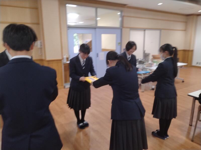 今日の給食の後、いつも通り係や先生方から連絡がある中、生徒会執行部より大切なお知らせが。いよいよ本格的に始まる高校受験に向けて、9年生3人へのサプライズ企画が行われました。