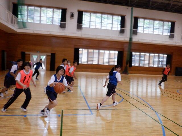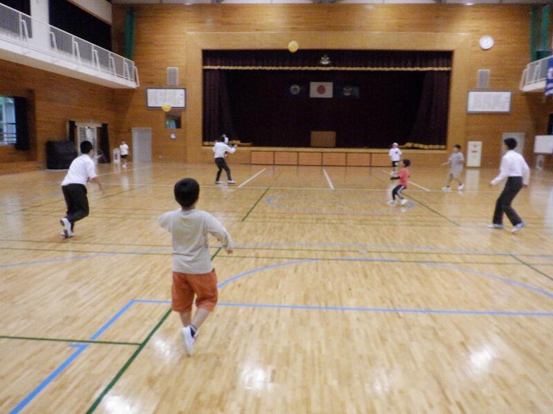 このボール遊びは、体育館内を自由に動き回り、当てられたら周りで待機。ところが、自分を当てた相手が他の人に当てられたら復活できる、というルールです。前期の子どもが果敢に後期のお兄さんお姉さんにアタックしたり、後期の生徒がゆっくり前期の子に投げてあげたり、まさに義務教育学校ならでは、の光景が見られました。もちろん同学年同士の真剣勝負や兄弟姉妹対決もあります。さらにボールが2個あるので、大忙しです。みんな汗びっしょりになって楽しんでいました。
