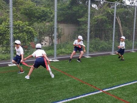 次に、2人1組になって、追いかけっこをします。色の違うマーカーを置き、鬼は全力で追いかけ、逃げる人は指定されたマーカーに鬼が来たらこちらも全力で逃げます。これを何度か繰り返してコツをつかんだところで、いよいよバトンパスの練習です。鬼はバトンを持ち、逃げる方はタイミングを計ってスタート。走りながらバトンを受け取ります。始めはぶつかったり渡せなかったりしましたが、段々と要領をつかんできて、写真のような、かっこいいバトンパスができるようになりました。10月の体育大会が、楽しみです。