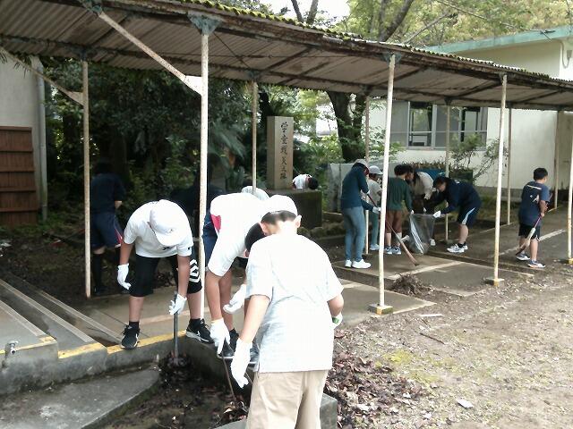 旧島野浦小学校の敷地内に、慰霊碑があります。これは、昭和20年5月、島野浦で起きた空襲による犠牲者を慰霊するものです。本校では毎年、この時期に慰霊碑の清掃を行っています。