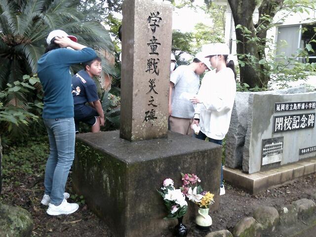 昨日、4~9年生が給食の後歩いて旧小学校へ。役割分担をしてから早速、作業に取りかかりました。ここ数日の雨で落ち葉が濡れていて集めるのが大変でしたが何とか袋に詰め、慰霊碑周辺の草を抜き、水をかけながらスポンジできれいにこすりました。そして最後に花を供えて、全員で黙祷を捧げました。さらにその後、前期課程は担任の先生より空襲の詳しい話を聞きました。