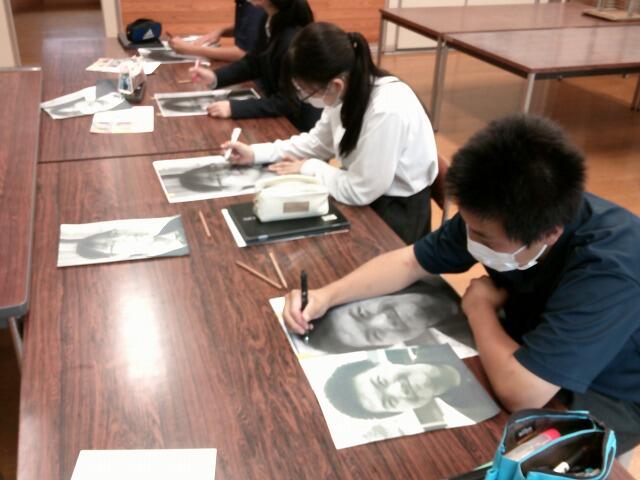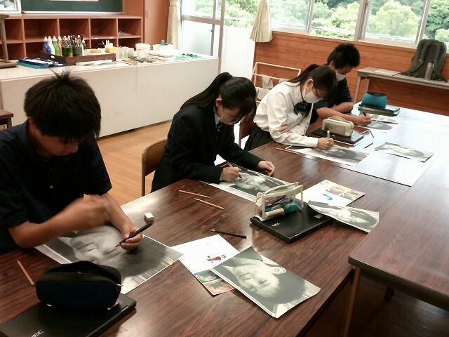 8年生は、自画像にチャレンジしていました。まだ取りかかり始めたばかりで、今日は自分の写真を見ながら、目・鼻・口などの輪郭や色の濃淡などを確認していました。一方、9年生はポスター制作です。例年、この島野浦学園から入賞者が出ており、今年の9年生もプレッシャーを感じつつ、真剣に取り組んでいました。どちらの学年も、できあがりが楽しみです。