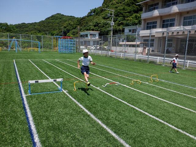 2~4年生の体育では、ミニハードル走に取り組んでいます。