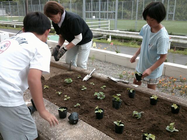 4年生は、4月にまいたヘチマの苗を花壇に植えかえました。子葉から本葉が3枚ほど出てきて、これからどんどん大きくなるはずです。最終的にはネットを張って、2階のベランダに到達するぐらい成長することを願いながら植えました。