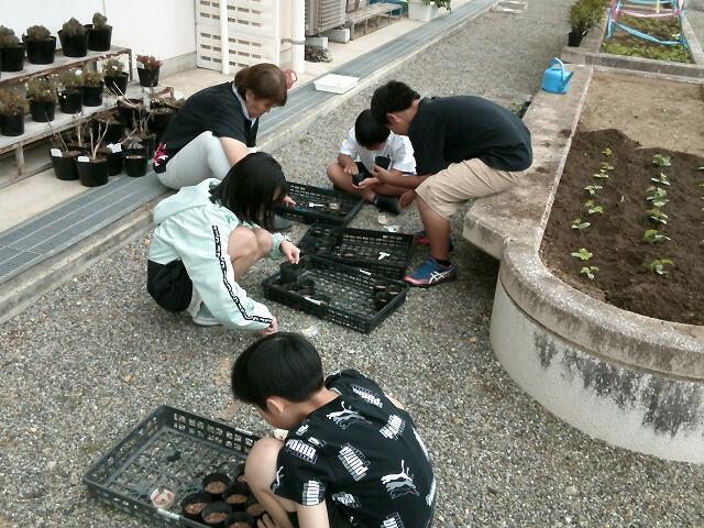 5年生は、植物の発芽と成長について学習しています。比較実験を通して、発芽には水と空気と適当な温度が必要だということを知り、次は成長のための条件を調べます。そこで、発芽した種をポットに移し替える作業をしました。こちらも、早く土から芽が顔を出し、ぐんぐん成長してくれることを願います。