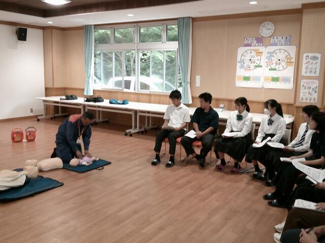 今日の6時間目に、延岡市消防本部の方をお招きして、後期課程8名と職員を対象にした心肺蘇生法の講習会が行われました。
