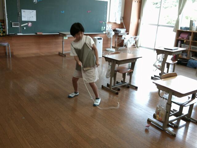 運動広場では、暑さにも負けず、2・3年生がフリスビーで遊んでいました。一方、それ以外の子ども達は教室でコマ回しをしたりルービックキューブをしたり黒板にアート作品を描いたりして、のんびり過ごしていました。明日は、振替休業日です。