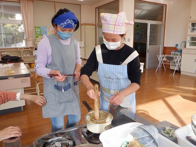 身支度を整え、きれいに手を洗ったら調理スタート。まずはジャガイモ、タマネギ、にんじん、鶏肉を手分けして切ります。次に、お鍋で肉を炒め、野菜、水を投入。具材に火が通ったところで牛乳を入れ、仕上げに彩りのインゲンを加えます。今回は市販のルウは使わず、小麦粉でとろみをつけ、バター、コンソメ、塩こしょうで味を整えていきました。家庭科室内にいい香りが漂い始め、10分ほど煮込んでから何度か味見をし、3人の共同作業でついに完成。心も体もポッカポカになるあったかシチューを、おいしくいただきました。