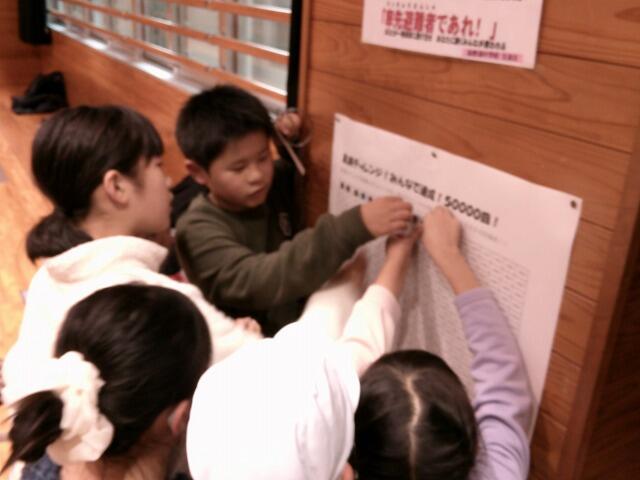 また、それぞれが跳んだ回数を合体させて、学園全体で50000回跳ぼう、というイベントも開催中です。100回跳ぶごとに、シールを貼ることができます。早速、昼休みに前期から後期まで体育館に集まり、音楽に合わせて軽快に跳んでいました。そして最後には、いっぱいシールが貼られていました。果たして、目標を達成することができるでしょうか。